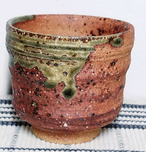 Light tan clay, wood-fired with kiln effects in the pinkish brown range, fly ash deposits, and vitrified natural ash glazing, with one bidoro tear. The base and the interior of the foot ring largely escaped the kiln effects, showing the natural color of the baked clay..Weight: 164 g (5.8 oz). Height: 7.6 cm (3 in). Width (at the widest point at the rim): 7.9 cm (3-1/8 in).